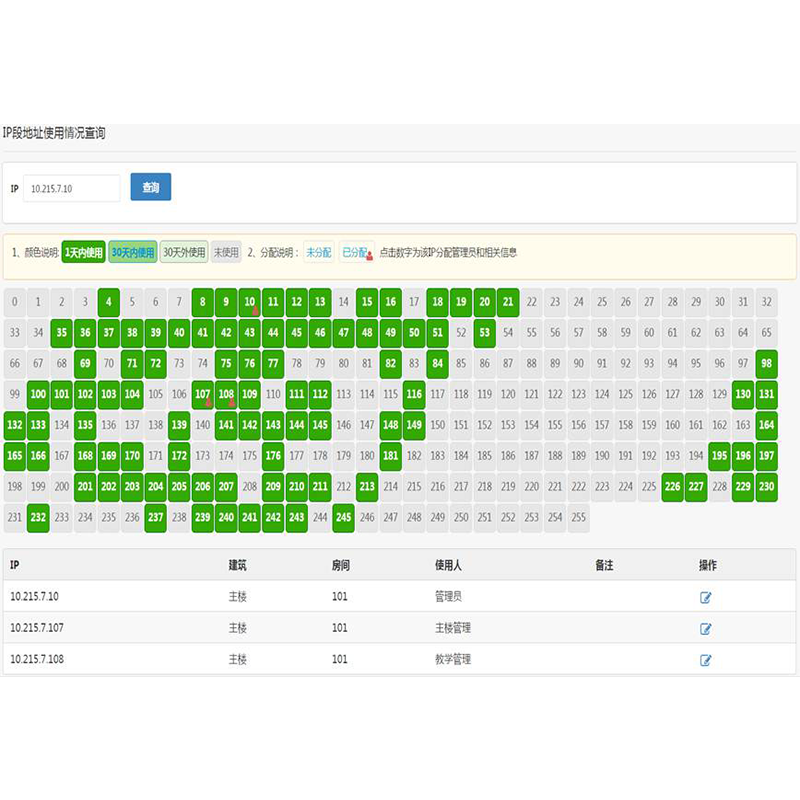 IP地址是IT服务的基础,对其分配规划以及使用情况的分析对管理好用户的IT基础设施是至关重要的。系统可以帮助用户对IP进行有效的管理,从分配规划到监控用户的使用状态,即监控每个入网设备的IP、MAC、所在设备接口的情况,监控每个网段的IP地址使用情况,便于管理员及时进行信息查找和调整管理策略。对于网络安全要求级别比较高的用户可以在系统中实现IP地址、设备MAC和接入端口的三元组绑定,一旦有非法的接入可以送出告警甚至对用户的接入端口直接进行断网处理。